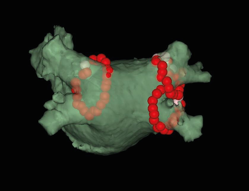 Obr.: Elektroanatomická mapa levé srdeční síně včetně CT zobrazení se znázorněním izolační linie kolem plicních žil (červené body)