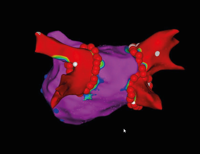 Obr.: Elektroanatomická mapa levé srdeční síně včetně CT zobrazení se znázorněním izolační linie kolem plicních žil (červené body)