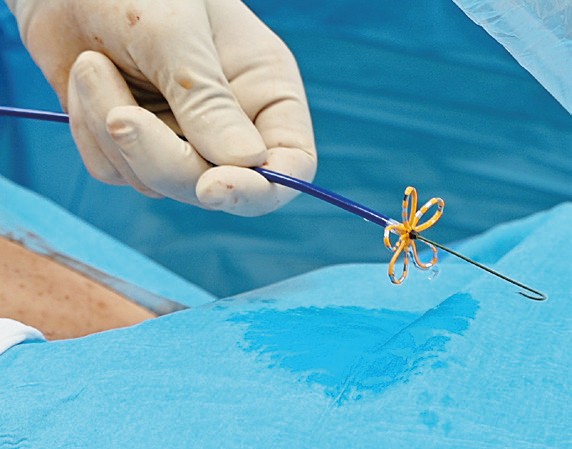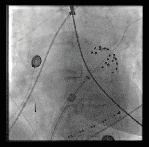 Obr.: katetr používaný k aplikaci pulzní energie a jeho zobrazení na rentgenu v ústí levostranných plicních žil